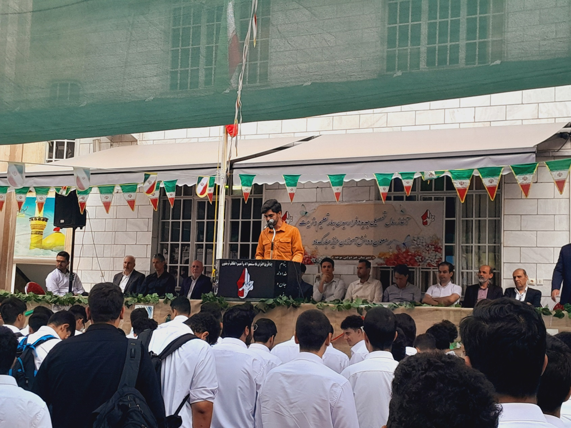 پس از پایان سخنرانی مدیر محترم دبیرستان آقای دهقان معاون پرورشی درخصوص هفته دفاع مقدس و رشادت و از جان گذشتگی شهدا هشت سال دفاع مقدس ، شهدا مدافع حرم و جنگ 12 روزه گفتند ، اگر نبود جانفشانی و فداکاری پدران ، مادران ، برادران شما برای دفاع از وطن اکنون ما در امنیت زندگی نمی کردیم. اگر مدافعین حرم برای دفاع از حرم اهل بیت در عراق و سوریه از خود گذشتگی نمی کردند، باردیگر خون اهل بیت و یاد و خاطره فداکاری آنان برای ما زنده نمی شد.
