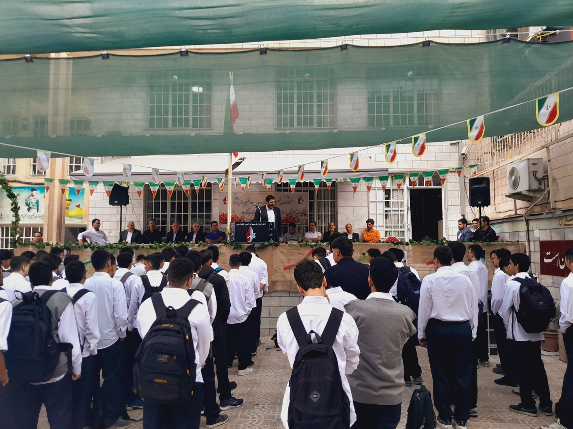 از 7:30 با پخش سرودهای شاد مناسب بازگشایی مدرسه و ویژه سروده هایی در وصف ماه مهر و مدرسه. شور و نشاط وصف ناپذیر در بین دانش آموزان دمیده شد. سپس مراسم آغازین بطور رسمی از 8 صبح با نواختن زنگ مدرسه شروع شد.